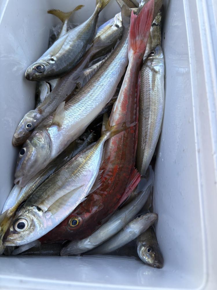 その後は転々とするもののどこも似たような感じでした。 10時頃早めにアジに切り替え最近攻めていなかった周辺から探り開始から中型混じりでダブル、ダブル、ダブルと!始まるかなと思っていると追加なく 最近やっているポイント周辺へ、ここはコマセが効いてくると小ぶり主体でしたがポツポツと釣れ続いてくれました。
